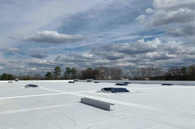 White TPO is used on the roof of a warehouse facility pursuing Green Globes, rather than traditional asphalt or black EPDM roofing. The high albedo material is designed to reflect light, limiting the amount of heat absorbed by the sounding area.