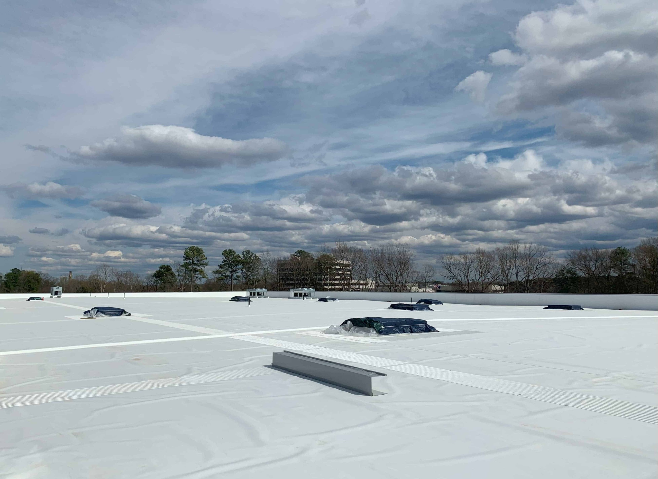 White TPO is used on the roof of a warehouse facility pursuing Green Globes, rather than traditional asphalt or black EPDM roofing. The high albedo material is designed to reflect light, limiting the amount of heat absorbed by the sounding area.