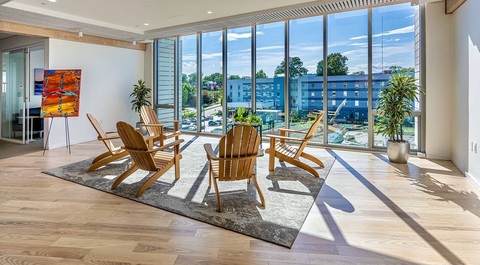 At Apex Plaza there are many small gathering spaces for coworkers to meet, but this one sits next to floor to ceiling windows bringing in the natural sunlight.