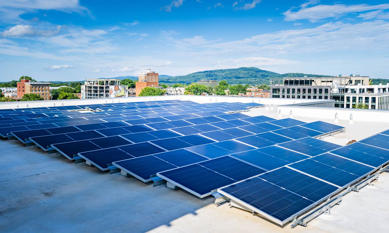 Solar panels on the roof of Apex Plaza. In total, the building has 875 panels