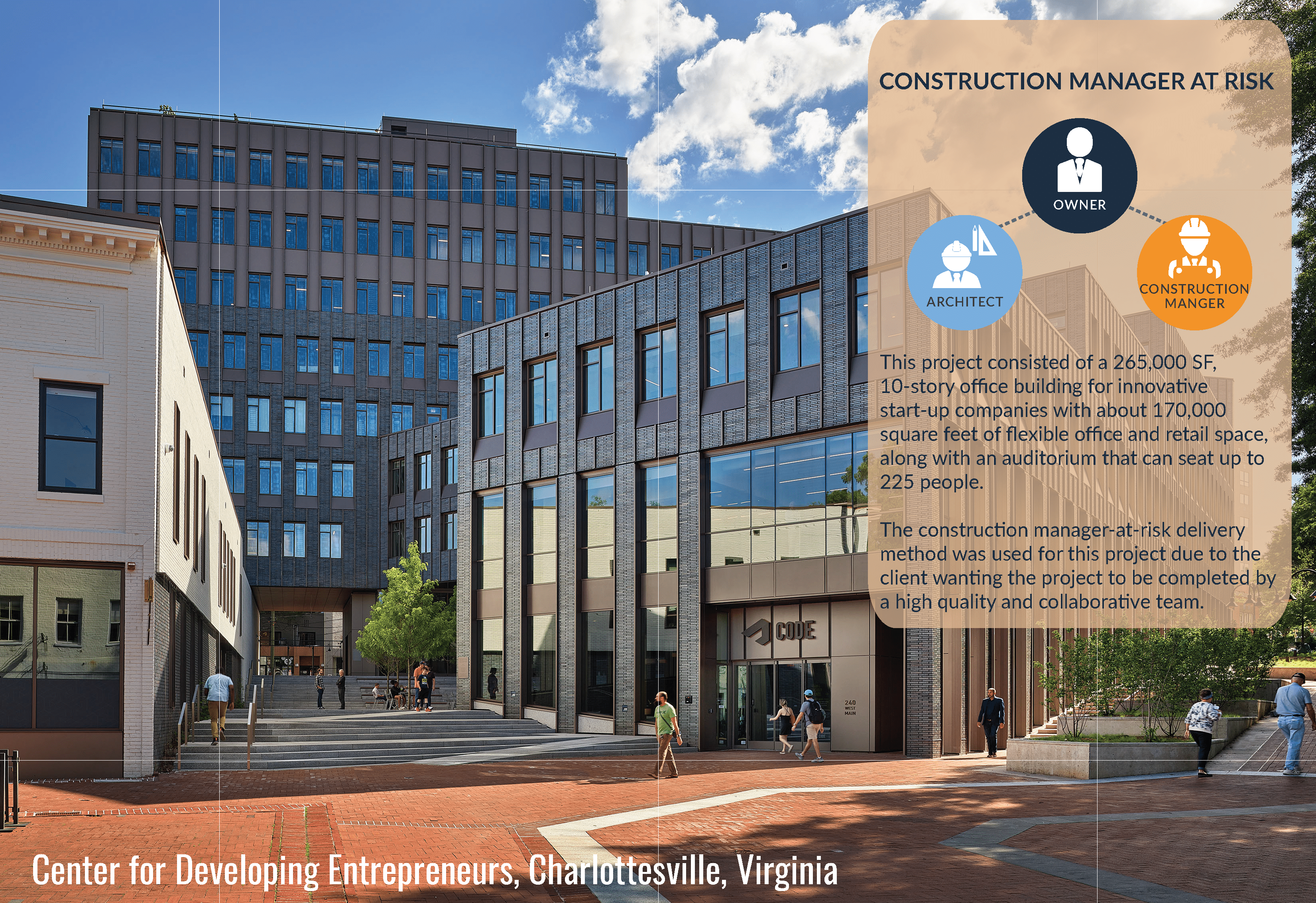 The design-build method is a fast-growing delivery method in which the client hires a design-builder who takes full responsibility for the entire project including the design and construction processes. This delivery method fosters increased collaboration and delivers the fastest option for a project due to the significant overlap of construction and design. According to the design-build Institute of America, the design-build delivery method holds 47% of the total share of US construction dollars and is 102% faster than design-bid-build. Advantages of this method are simplified decision-making, better collaboration, and overlap between the construction and design. These benefits reduce the number of change orders and increase the quality of the project. Another advantage is that the team is selected based on qualifications over cost.